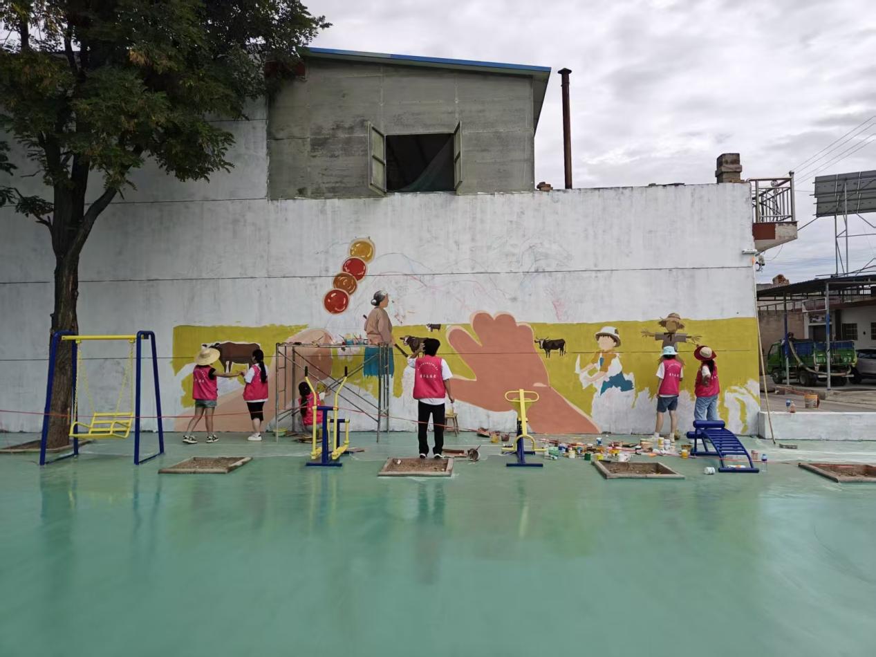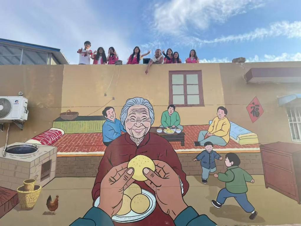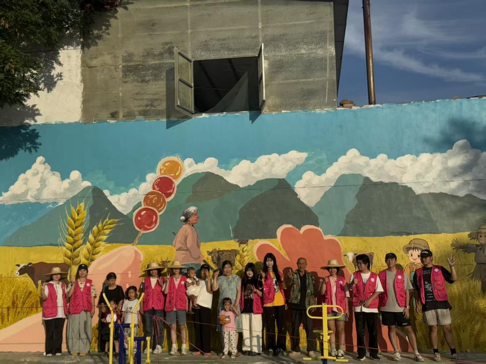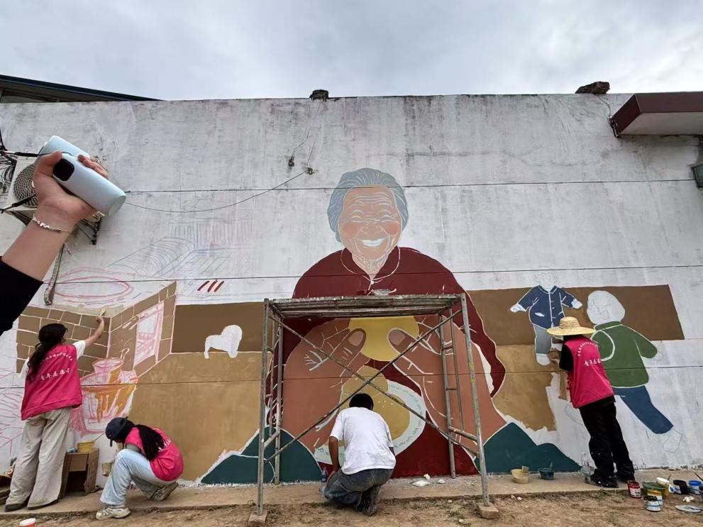 “实践兴乡·染色季”实践队以“墙绘赋能乡村美育”为核心,闲置墙面成艺术载体。前期走访,队员们深挖梯田、窑洞、农耕、民俗元素;创作时分工协作,勾勒、上色间,墙面“讲述”野狐坡故事。过程中,队员邀村民填色,墙绘现场变美育课堂,民俗与艺术相融,尽显“接地气、重参与”特色。